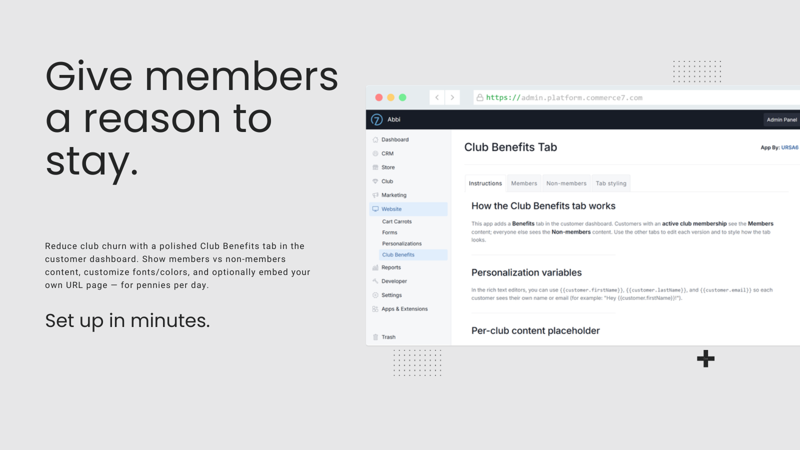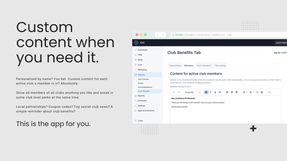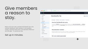 Reduce club churn with a polished Benefits tab in the customer dashboard. Show members vs non-members content, customize fonts/colors, and optionally embed your own URL page — for pennies per day. Showcase your club benefits today!